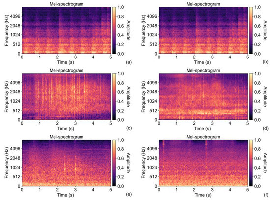Mel-spectrograms of particular samples (machines) from toy-car, toy-train, fan, and valve classes within the extracted dataset: (a) toy-car number 67, (b) toy-car number 221, (c) toy-train number 74, (d) toy-train number 240, (e) fan number 150, and (f) valve number 238.