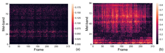 In order to demonstrate the possibility of linking the results of the image similarity estimation to the most distinctive features of the mel-spectrograms, the distance between two corresponding points was calculated for every single pixel of two compared images x and y, as given in Equation (3), but without summing the results. The illustrative examples in the form of a heat map are given in Figure 12, which compares two similar mel-spectrograms in Figure 12a (those from Figure 11a,b) and two dissimilar mel-spectrograms in Figure 12b (those from Figure 11a,c). The distance values between the similar mel-spectrograms are small, as indicated by the dark color in Figure 12a. The distribution of this dark color is rather uniform. Nevertheless, there are some vertical and horizontal stripes of a slightly brighter color that can be associated with particular components in either of the mel-spectrograms. On the other hand, the distance values in Figure 12b are greater than those in Figure 12a. Here, the bright color (large distance) is present at mid and high frequencies from approximately 1 s to 4 s, which is a consequence of the high levels present in the mel-spectrogram of toy-train number 74. The bright color is also present along the time axis at low frequencies, and it is caused by high levels in the mel-spectrogram of toy-car number 67.