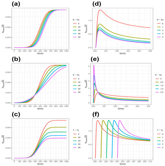 (a–c) ExG distribution hazard function change by parameters given ; (d–f) SW distribution hazard function change by parameters given .