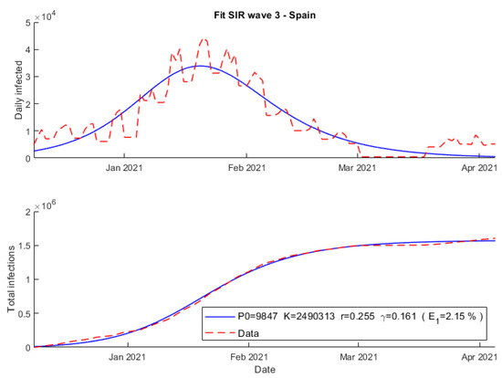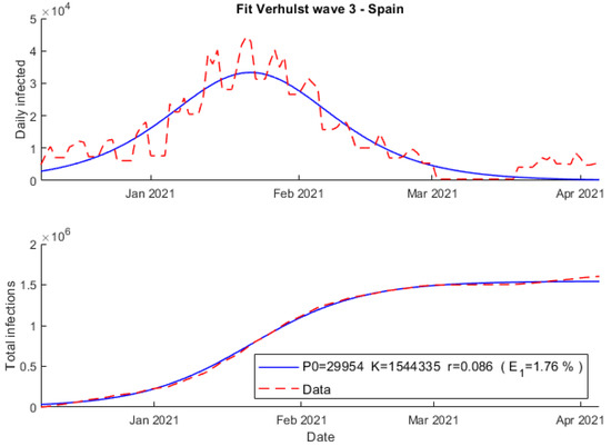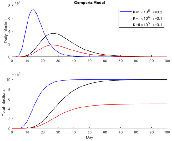 Figure 6, with an error of 2.15%, a growth rate of r = 0.255 and a recovery rate of 0.161. It is important to note that, unlike Verhulst’s and Gompertz’s fits, the SIR model does not need to reach the carrying capacity, K ≈ 2.5 × 106, at the end of an outbreak. This could be visualized in