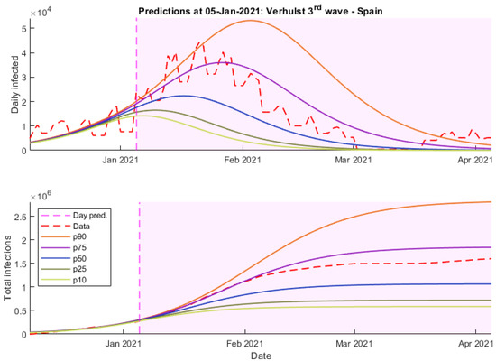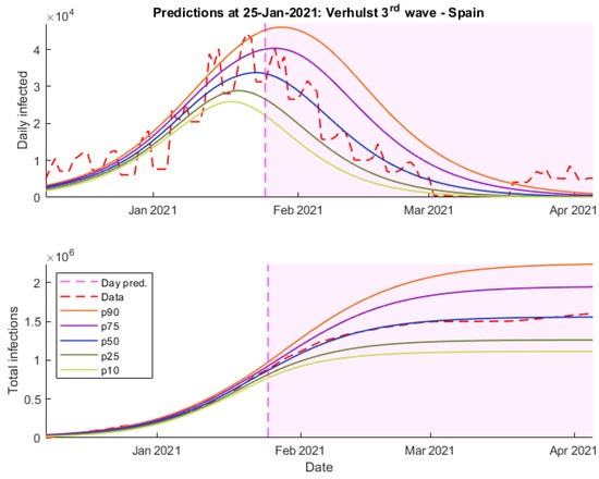Figure 10, the 75th and 90th Verhulst percentiles are the only ones that correctly predict the fast growth of daily infections at the beginning of the outbreak.
