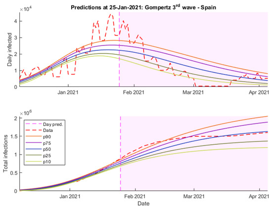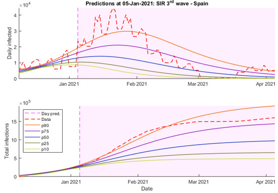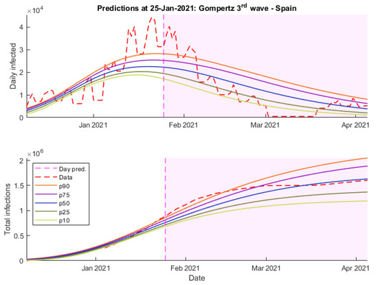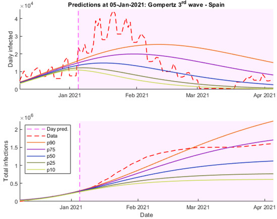 With the aim of giving a general idea about the effectiveness of the different models at making predictions, two examples of it will be presented, the first one made on 5 January 2021 and the second one on 25 January, a few days after the peak of the wave in daily cases.