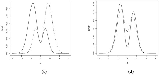 Distributions (a) BESN(0.8,0) (solid line), BESN(0.2,0) (dashed line); (b) BESN(0,10) (solid line), BESN(0,2) (dashed line); (c) BESN(0.05,10) (solid line), BESN(0.05,2) (dashed line); and (d) BESN(0.2,4) (solid line), BESN(−0.2,4) (dashed line).