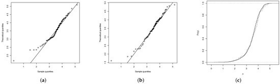 Figure 4b,c show the qq-plot for the BESN model and the empirical cdf. The plots suggest a better fit for the BESN model than its competitors.