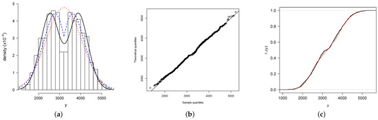 (a) Histogram for the variable birthweight. Estimated pdf: N (dotted red line), TN (dashed blue line) and BESN (solid black line). (b) QQ-plot for the BESN distribution. (c) Empirical cdf for the variable birthweight (solid black line) and cdf of the BESN distribution (dotted red line).