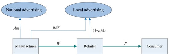 Berger [] first discussed cooperative advertising in a manufacturer–retailer channel, proposing a financing of advertising expenditures through a discount on the wholesale price by the retailer. Cooperative advertising is an interactive scheme in a supply chain system in which the manufacturer pays a part of the advertising expenditure incurred by the retailer in local advertisement. Fulop [] considered that cooperative advertising was an important aspect of promotional activities by many manufacturers. Manufacturers can enhance brand image and boost sales through a cooperative advertising strategy. As distinguished by Bergen and John [], advertising could be divided into national advertising and local advertising. For retailers, local advertising investment can attract potential customers to buy products. The goal of participating in the local advertising expenditure by the manufacturer is to influence the retailer to invest more, which can generate more sales [,].