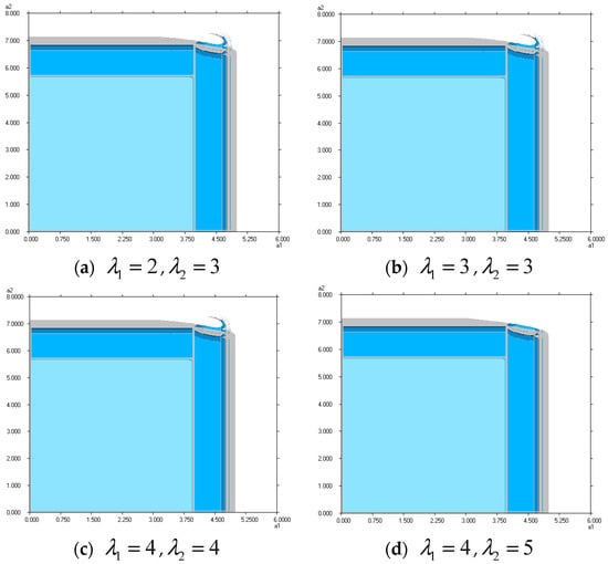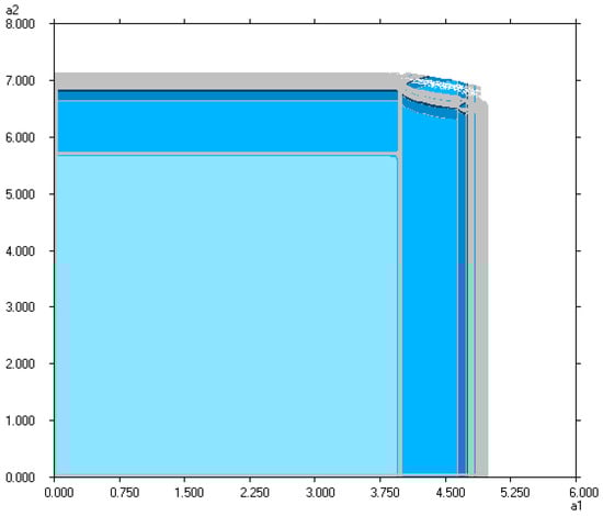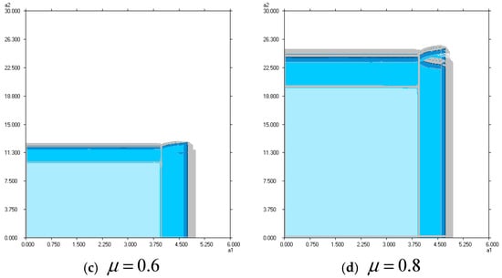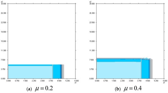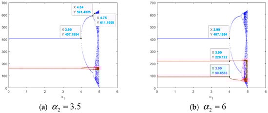 Dynamic characteristics can be expressed in the 2D bifurcation diagram []. In Figure 3, the light blue area stands for the stable region, while the bright blue, the dark blue, and the deep blue stand for the period-2, period-4, and period-8 stable regions. With the parameters and increasing continuously, the system will go into a chaos state. The chaos and divergence regions are shown by the gray and the white areas, respectively, which indicates that one enterprise will quit out of the market in economics. Figure 3 shows that has better stability than , illustrated by its larger stable region.
