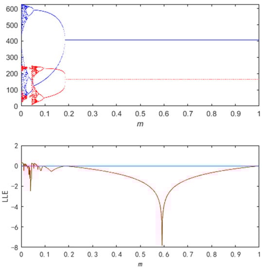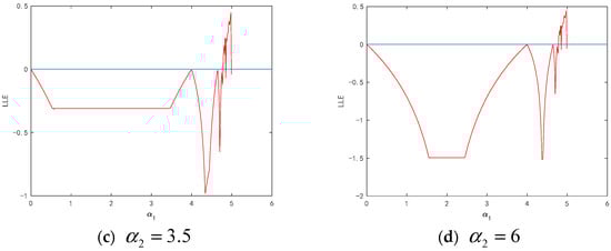 Figure 17 shows the bifurcation and LLE diagram with respect to parameter with and . The system changes from chaos to stability when parameter is . returns to Nash equilibrium with an increase in parameter .