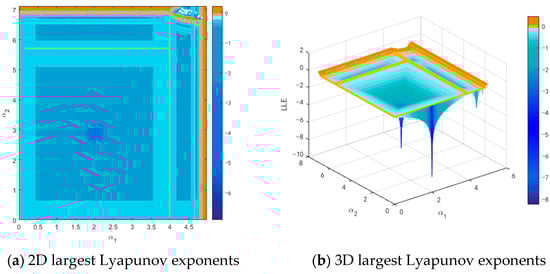 The corresponding Double Largest Lyapunov Exponents (DLLE) with respect to and are shown in Figure 6a,b. The blue areas are with a color transition from dark blue to light blue. When the LLE tends to 0, the color becomes light khaki and the system is in period-2 and period-4 stable cycles, etc. The dark khaki areas with the means the system is in chaos and divergence. Researchers can see the trend of system state from order to disorder by the perspective of LLE.