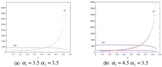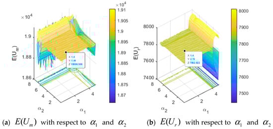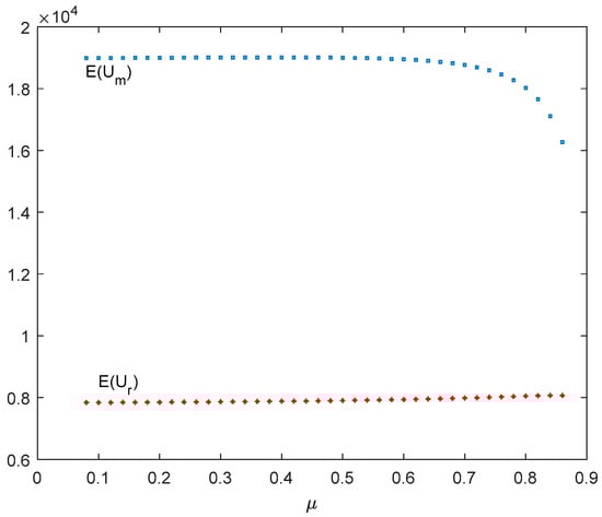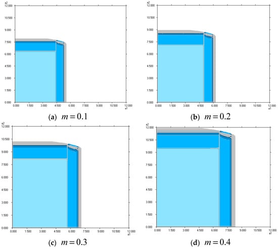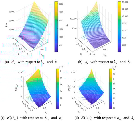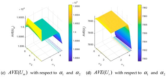 (3) The expected utilities and rise with an increase in effect coefficients and . The expected utility grows slowly with an increase in ; meanwhile, growth is rapid relative to an increase in . Researchers can also see from the trend of the graph in Figure 16c that the expected utility grows slowly with an increase in ; meanwhile, growth is rapid relative to an increase in . These correspond to Figure 16d. The effect coefficient of the opponent has a greater impact on its own expected utility. Therefore, in order to obtain more expected utilities and less advertising expenditures, while decreasing their own effect coefficient, the manufacturer and retailer will be willing to increase the opponent’s effect coefficient to gain the most revenue.