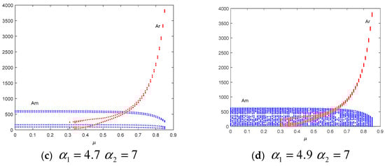 Figure 8 clearly indicates the 2D bifurcation diagrams of the system with , respectively. From the 2D bifurcation diagrams, researchers can clearly know that different bifurcation curves correspond to different values of parameter . Researchers can find that rarely has influence on the stable region of . However, has a greater influence on the stable region of , which becomes larger with a greater . This indicates that the participation rate of local advertising by the manufacturer has a positive impact on the system’s stability, that is, the higher the degree of the manufacturer’s participation rate, the harder for the Nash equilibrium point to lose its stability.
