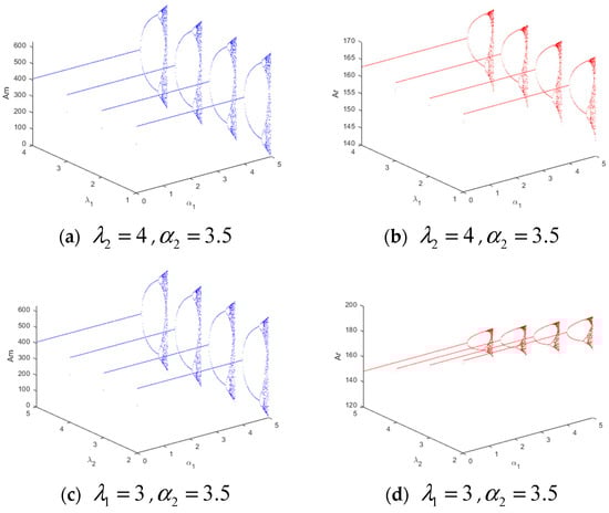 Figure 15a,b are the 3D bifurcation diagrams with respect to the parameters , , and , , , respectively. Figure 15c,d are the 3D bifurcation diagrams with the parameters , , and , , , respectively. Researchers can find that the Nash equilibrium is changed with effect coefficients and . As shown in Figure 15a,b, the values of the Nash equilibrium increase with the increase in . As shown in Figure 15c,d, the increase in can increase the values of the Nash equilibrium . Meanwhile, the bifurcations and the chaos of the system are indicated clearly.