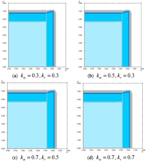 (2) The expected utility decreases and remains unchanged with an increase in risk tolerance level . The expected utility increases and decreases with an increase in risk tolerance level . These correspond to Figure 13c,d. Therefore, in order to obtain more expected utilities, the manufacturer and retailer will try to reduce their own risk tolerance levels. Meanwhile, the manufacturer wants to increase the risk tolerance level of retailer for its own revenue.
