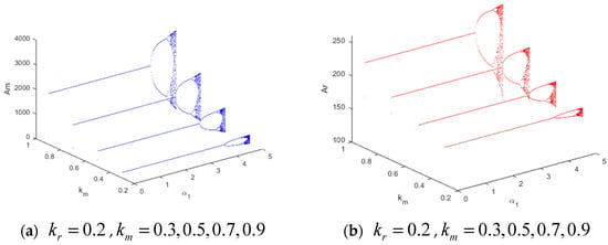 Figure 9 shows the bifurcation diagram of and with respect to when the system is stable, during period-2 bifurcation, period-4 bifurcation, and chaos, respectively, with and taking different values. Researchers can see that decreases slightly, but increases dramatically as increases. Therefore, the greater the participation rate in local advertising by the manufacturer, the more the retailer spends on the local advertising expenditure. However, the manufacturer’s national advertising expenditure only has a slight downward adjustment with the increase of participation rate .