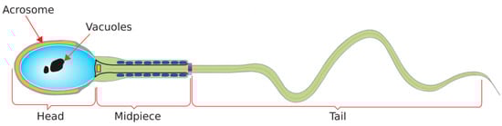 This paper uses a freely available benchmarked MHSMA [16] derived from the HSMA-DS dataset [17]. Experts marked this dataset with the help of guidelines provided by [18,19]. A well-defined acrosome makes up 40 to 70% of the sperm head, and the sperm head’s length and width are between 3 and 5 m and 2 and 3 m, respectively. The presence of vacuoles shows that the sperm is abnormal. Axially, the midpiece is around 1 micrometer wide, making it one and a half times as big as the head. Additionally, the typical tail features, such as homogeneity, uncoiling, being thinner than the mid-piece, and having a length of 45 m, must be discernible. Figure 1 shows a schematic of a sperm cell’s structure built on marked labels.