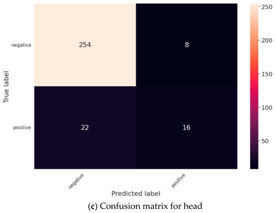 We utilized numerical and visual performance indicators to assess the effectiveness of the models introduced in this paper. The following equations present these numerical evaluation metrics: (2)–(6). The symbols TP, FP, TN, and FN stand for true positive (normal sperms correctly recognized), false positive (abnormal sperms wrongly identified), true negative (abnormal sperms correctly identified), and false negative (normal sperms incorrectly detected) in these equations, respectively. Similarly, Equations (5) and (6) describe the f0.5 and f1 scores, respectively. Figure 4 displays the confusion matrix for different labels of the given dataset.