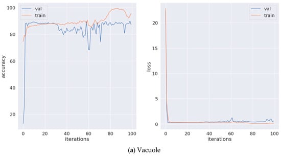 We separately trained the model to classify the sperm’s head, acrosome, and vacuole. We introduced our model with 1000 samples on 100 iterations (epochs) because we achieved the highest accuracy on 100 iterations. The validation set (240 pieces) determines the loss value after each iteration, and the checkpoint with the lowest validation loss is stored. We assessed the saved checkpoint on the held-out test set after training (300 samples). Figure 5 displays the accuracy and loss during the training and validation for each label over training iterations. Our proposed technique can independently predict abnormality in the sperm head, acrosome, and vacuole with an accuracy of 88.6%, 89%, and 92%, respectively. Table 6 compares our proposed model with pre-trained modern deep-learning architectures.