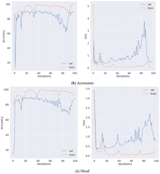 Progression of accuracy and loss on the validation set during sequential deep-learning model training. In this graph, the orange line represents the highest validation accuracy achieved, and the blue line represents the highest training accuracy achieved in the (a) vacuole, (b) acrosome, and (c) head. Similarly, the right side of the graph shows maximum validation loss with the blue line and maximum training loss with the orange line.