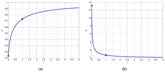 Figure 2 illustrates performance deterioration due to increase in , where and are shown. The result based on Riccati equation with results in the same result as that based on Lyapunov equation. It can be seen from the Kalman gain equation that when the measurement noise r increases to a very large value, becomes very small and approaches 1 in this example. Figure 3 shows the variations of covariance and Kalman gain as r increases. For two selected values of r, the corresponding covariance and Kalman gain are given by: (1) : and ; (2) : and , as indicated by the circle symbols in the figure.