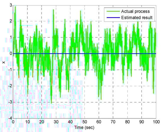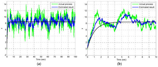 Figure 11 provides the estimation result in the case of additional deterministic control input. The plot on the right provides a close look at the time interval 0–10 s. The curve in black indicates the response due to the deterministic control input. The results are consistent with the theoretical result shown as in Figure 2 in Example 1.