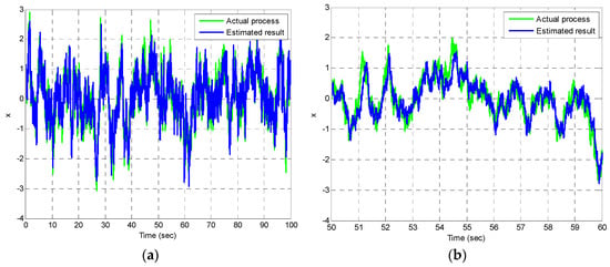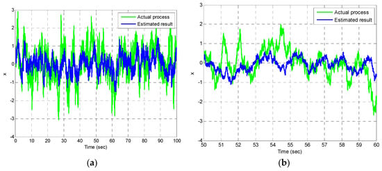 Figure 4, Figure 5 and Figure 6 provide the state estimation results for the first-order Gauss-Markov process with various values of r. The state estimation in the case of a very large measurement noise r () is shown in Figure 4. In this case, the Kalman filter gain approaches 0, and the correction capability on state vector is no longer available, meaning that only time update is implemented. Figure 5 and Figure 6 present the estimation results in the case of larger () and smaller () measurement noises, respectively are involved. The plot on the right provides a closer look at the time interval 50–60 s for better observation. To collect the data for calculating the error variance from the estimation results, a recursive loop for evaluating estimation errors is employed based on Figure 7.