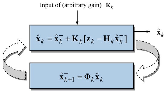 The steady-state Kalman filter is considered a type of suboptimal filter, which has a constant gain matrix during the estimation process. It is applicable in some applications with some limitations and can be realized through the analog circuit, which is particularly attractive in real-time applications at the cost of some performance degradation. However, under the conditions of a time-varying environment, where the process and measurement models change with time, the adaptive Kalman filter (AKF) is popular through tuning the covariance parameters and . In such a case, the steady-state Kalman filter may not be able to comply with the desired flexibility. Furthermore, when compared to the other filters, the Suboptimal Kalman filter (SKF) has identical tracking accuracy and is highly scalable. The SKFs are designed in a feedback-controlled system to obtain the estimation of the root-mean-square error. It simply requires the filtering calculation and foregoes the reasonably priced enhanced high-dimension computation and the challenging smoothing computation, resulting in a less computational load [20,21,22,23].