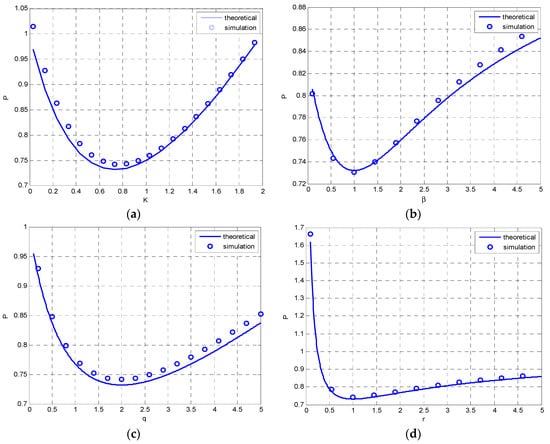 Performance degradation due to deviation of Kalman gain , and three other parameters, including , , and , respectively, is examined in Figure 8. In each of the four plots, two sets of results are shown for observation of the effect by deviation of the parameters from the appropriate points and also for consistency check of DKF and CKF results. The solid lines represent the theoretical values while the circles are based on the DKF, respectively. Figure 9 provides a three-dimensional surface and contour of the covariance due to deviation of and from the optimal point. In this case and , as indicated by a circle symbol on the figure.