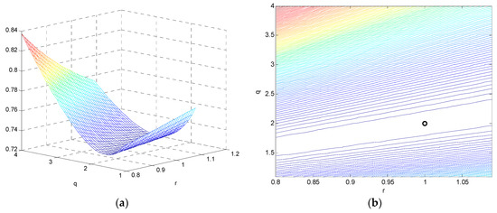 Three–dimensional surface and contour of the covariance due to deviation of and from the optimal point (in this case and , as indicated by a circle symbol on the figure) (a) surface plot; (b) contour plot.