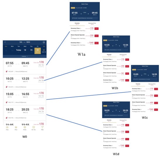 GUIs that differ in appearance (images, text, colors, and size) but have the same functionality, structure, and internal logical relationships between interfaces are isomorphic. Figure 1 shows an example of an isomorphic GUI for Eastern Airlines. Figure 1 (W0) shows the flight list interface for a ticket search while (W1a) to (W1d) show a detailed interface with four columns of flights; (W1a) to (W1d) differ only in the specific image and text information.