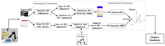 We discuss our semantic similarity-based method for identifying isomorphic GUIs in this section. The identification of GUI isomorphic interfaces is a comparison of GUI structure graphs and GUI semantic similarity. Figure 2 shows the overall architecture of the method. The flow of the method can be divided into three steps: extracting GUI information, vectorizing GUI information, and identifying isomorphic GUIs. First, the class and location of GUI elements are identified by the YOLOv5 target detection network [3]. Removing textual information will greatly reduce the difficulty of GUI modeling. However, the skeleton-only GUI model may recognize non-isomorphic GUIs as isomorphic GUIs [15]. The element text is recognized by optical character recognition (OCR). The semantics of the GUI elements are obtained through a comparison of the text recognition results with the created domain application ontology model (DAOM). Then, the GUI structure map is constructed based on the type and location information of the GUI, the interface text noise effect is eliminated, and the GUI structure vector is extracted by an autoencoder [15]. A pre-trained Sentence-BERT language model is used to extract the interface semantic feature vector [29]. Finally, the GUI structure vector and the semantic vector are combined into a GUI interface embedding vector. The isomorphic GUIs are then identified by cosine similarity.