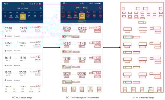 The semantics of an element is defined as the content of the element text or the name of the named entity. As shown in Figure 3a, the semantics of “SIA” is the text “SIA”, which represents the country Singapore. The complexity of the GUI context poses a great difficulty for text recognition. This paper uses optical character recognition (OCR) for the character recognition of text elements in GUI elements to ensure the accuracy of text element recognition.