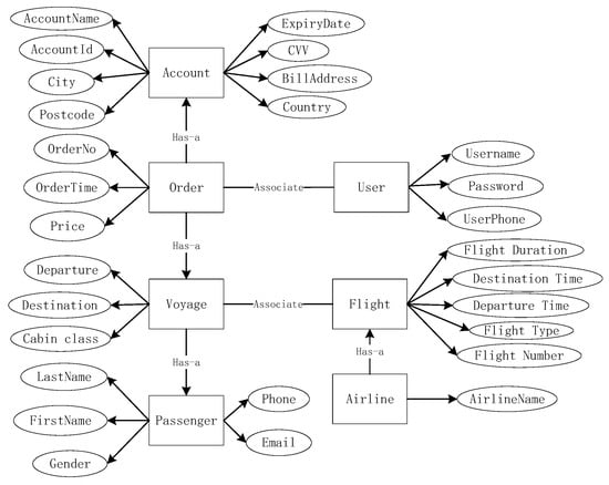 The DAOM is a unified description of the semantics of the GUI elements involved in a mobile application in the same domain. The same domain refers to mobile applications that provide the same or similar services, e.g., the booking software of different airlines belong to the same domain. We combine each airline booking software to manually construct the domain ontology of airline booking software. The domain knowledge is acquired in a common way to provide a common understanding of the relevant concepts in the domain and to realize the sharing and reuse of knowledge among different systems. Some element entities and their attributes in the manually constructed airline booking domain ontology are shown in Figure 4. The results of text recognition are input to the DAOM. The generalized linguistic descriptions are transformed into a unified and standardized element description language through a comparison of the ontology domain knowledge base. A unified description of the main functional elements, for example, flight information, usually includes information such as ID, time, price, etc. Incorporating all this information into the model forms a unified description of the order.