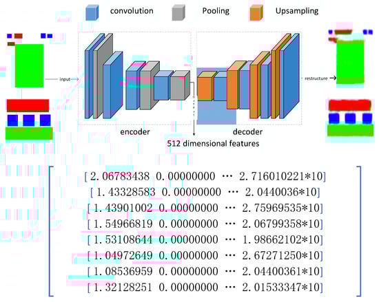 For the convolutional autoencoder, both the encoder and decoder are modeled as convolutional neural networks. Figure 5 shows the network structure of the autoencoder used in this paper. First, the min-max method is used to normalize the 128 × 128 GUI structure map to improve the performance of the model. Second, the feature vectors are extracted by auto-encoder. The encoder consists of four convolutional layers and four pooling layers. The input data are compressed by the encoder, and the 512-dimensional GUI structure feature vector is obtained after repeated iterations. The decoder contains four convolutional layers and four upsampling layers. The reconstructed GUI structure is output after iterations.