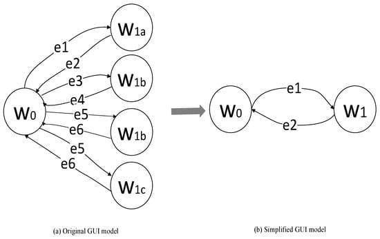 Finite State Machines (FSM) are used to generate models for GUI model generation. The model consists of nodes representing GUI states and edges representing interactions. Figure 6a shows the jump events from the five pages in Figure 1, ignoring the other buttons and internal components. In Figure 1, the four states jumped by state (W0) have different interfaces, but their logical structures and functions are the same. When constructing the GUI model, (W1a), (W1b), (W1c), and (W1d) transformed by state (W0) can be combined into one state, as shown in Figure 6b. This can reduce the number of states and simplify the GUI model. The key step in this process is the identification of isomorphic GUIs.