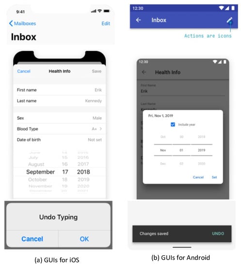 - Qin, X.; Zhong, H.; Wang, X. Migrating GUI test cases from iOS to Android. In Proceedings of the 28th ACM SIGSOFT International Symposium on Software Testing and Analysis (ISSTA 2019), Beijing, China, 15–19 July 2019; Association for Computing Machinery: New York, NY, USA, 2019; pp. 284–295. [Google Scholar]