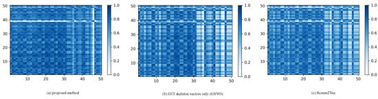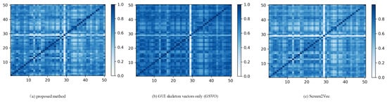 A total of 100 interfaces containing 109 pairs of isomorphic GUIs are intercepted from five pieces of software in the field of airline services selected from four Android smart devices with different resolutions. The heat map of similarity for the three methods for isomorphic GUI recognition at different resolutions is shown in Figure 10. The heat map is lighter in color compared to Figure 8, indicating that the recognition accuracy of the isomorphic GUI has decreased. However, the distribution of the similarity matrix is consistent with Figure 8 as a whole.