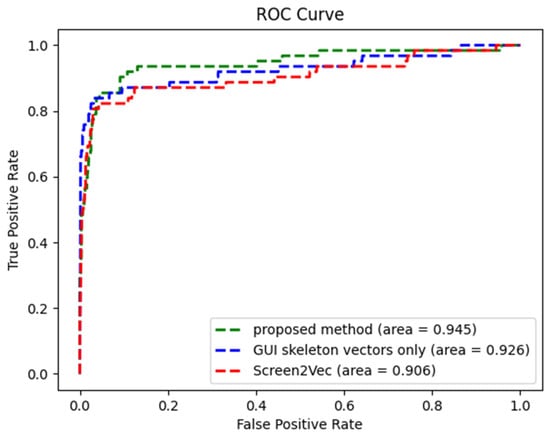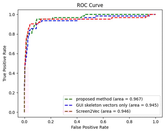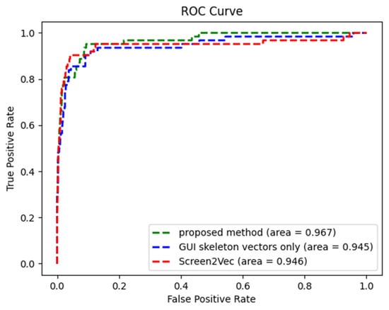 We plotted the receiver operating characteristic (ROC) curves of the three methods to compare the recognition results of the three methods for isomorphic GUIs. As shown in Figure 9, the area under the curve (AUC) of the three methods were 0.907, 0.852, and 0.906, respectively. The AUCs of all three methods were above 0.85. Our proposed method has the highest AUC value, which indicates that the proposed method has the highest accuracy value.
