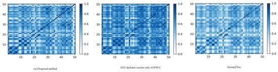 Figure 8 shows that the GSVO method heat map has the darkest color, indicating that the obtained GUI similarity value is high due to the fact that GSVO only constructs the GUI layout structure information vector. While the element text semantic information is ignored, the GUI feature vector acquires incomplete information, leading to the identification of non-isomorphic GUIs as isomorphic GUIs. The Screen2Vec method obtains the structure information along with the GUI text information. However, because of the differences in the textual representation of elements, some isomorphic GUIs are recognized as non-isomorphic GUIs, resulting in low GUI similarity values. Our proposed method shows superiority compared to the first two baseline models. The GUI structure vector is considered and the textual variability is taken into account. The text is transformed into domain ontology semantics, which is universal in the scope of the domain.
