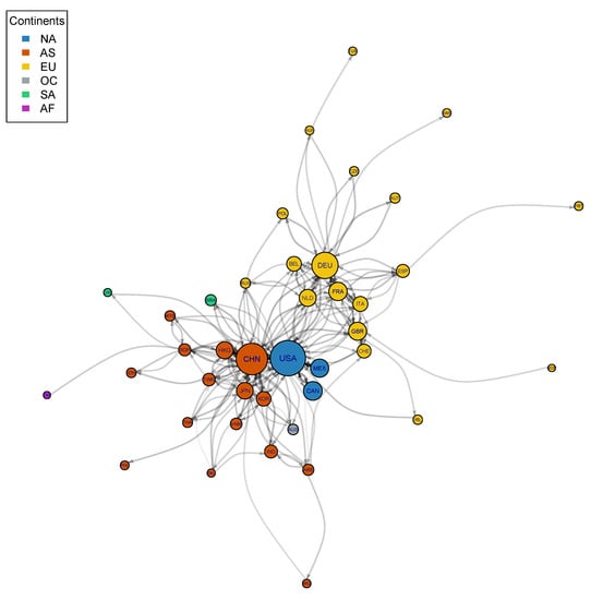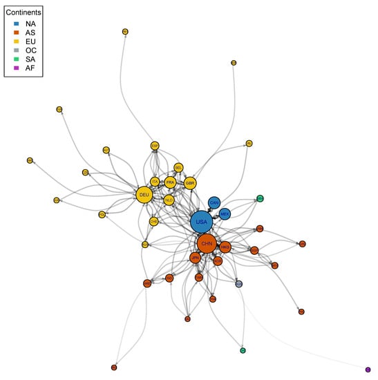 The three principal economies are the leaders of their respective hubs, with the USA heading the North American one, China the Asian one, and Germany the European one. These three nodes have the higher centrality (see Table A1 and Table A2), which is a similar result to other studies those in [4,45]. Then, most trade flows through these leaders, so mainly, the hub’s accompanying countries (the spokes) appear to be mostly indirectly trading with each other. For example, the countries in the United States–Mexico–Canada Agreement (USMCA)—previously the North American Free Trade Agreement (NAFTA)—appear to be highly dominant in the American continent. Nevertheless, there is no significant trade between Canada and Mexico, so trade toward Asia or Europe moves along through the USA and not directly.