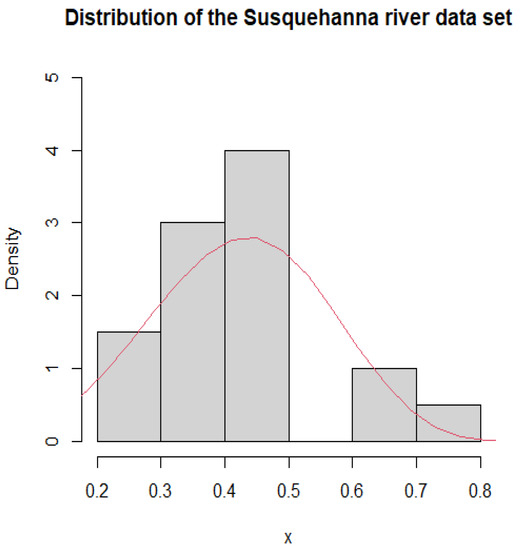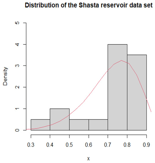 The first dataset describes the monthly water capacity from the Shasta reservoir in California, USA. The data are recorded for February from 1991 to 2010 (see for details the website http://cdec.water.ca.gov/reservoir_map.html (accessed on 15 December 2022), which can also be found in Sultana et al. [24]. The parameter estimates and the Kolmogorov–Smirnov (K-S) test correlation results are given in Table 14. The probability density fitting curves for the dataset are also shown in Figure 1, which means the dataset fits the distribution reasonably well. In fact, Nadar et al. [13] used this dataset to conduct statistical analyses on the distribution based on record data.