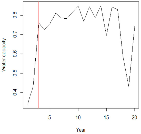 We applied the MIC test criteria of Equations (5)–(7). Under the null hypothesis , the is calculated as . Under the alternative hypothesis , is calculated as , which corresponds to . The corresponding estimated values of the parameters are , , , and with when using Equations (8) and (9). Since is less than , there is a change point occurring at position 3, which corresponds to the year 1993. According to Yates et al. [25], 1993 corresponded to a wet year in the Shasta reservoir, California. Figure 2 shows the dataset of monthly water capacity for the Shasta reservoir and the position of the change point.