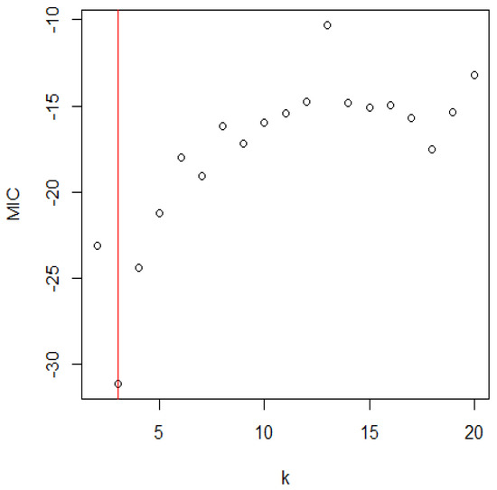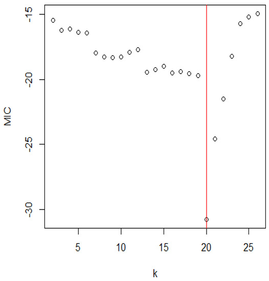 Figure 6 shows the MIC values for all possible values of k. The smallest value of the MIC corresponds to the estimated change location.