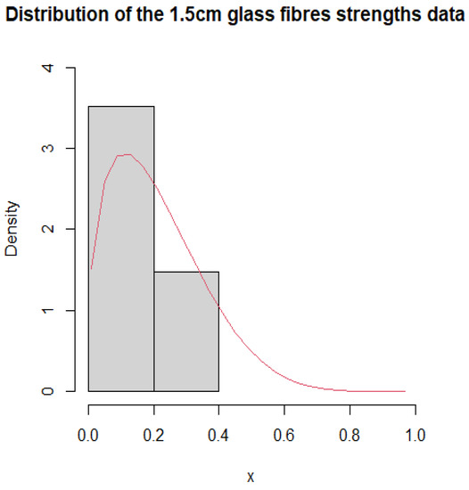 The third dataset represents the strengths of 1.5 cm glass fibres, initially obtained by workers at the UK National Physical Laboratory. Glass fiber is used to make a variety of products. It is a good electrical insulator; therefore, it is used in the manufacture of many electrical and electronic products and circuit boards. It is also a heat-resistant material used to make products that heat up quickly, such as batteries and motors. The observations of the dataset are found in Elgarhy [30]. The parameter estimates and the Kolmogorov–Smirnov (K–S) test correlation results are given in Table 16. The probability density fitting curves for the dataset are also shown in Figure 7. Thus, the dataset fit the distribution reasonably well.