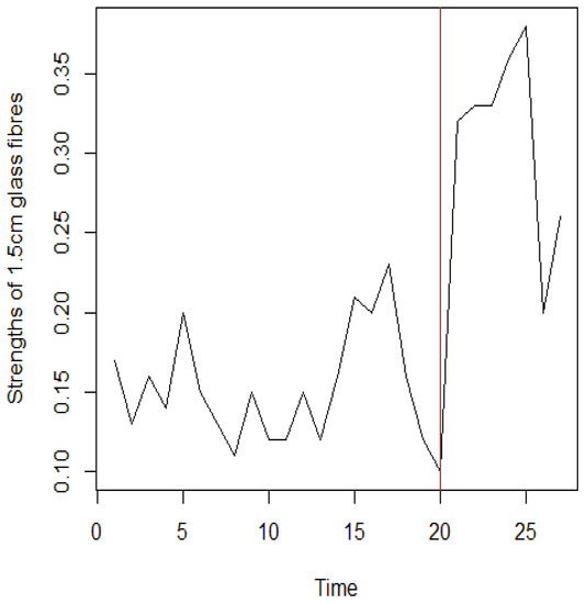 Under the null hypothesis , the was calculated as . Under the alternative hypothesis , was calculated as , which corresponds to . The corresponding estimated value of the parameters are , , , , and , with . Since is less than , that is to say, there is a change point occurring at position 20, it can be seen that a change point is indicated at the strength of the twentieth, corresponding to the dataset of 0.10. This shows that for the dataset of twenty-seven strengths, the strength of the glass fibers changes at the twentieth strength, and this change remains until the twenty-seventh strength. Figure 8 shows the original data and change point position.
