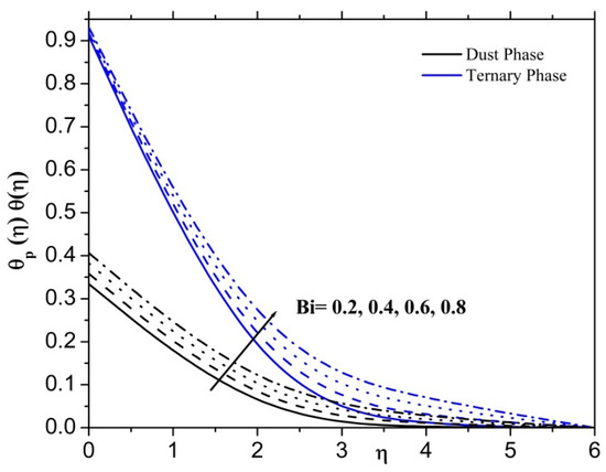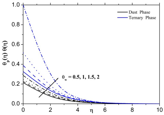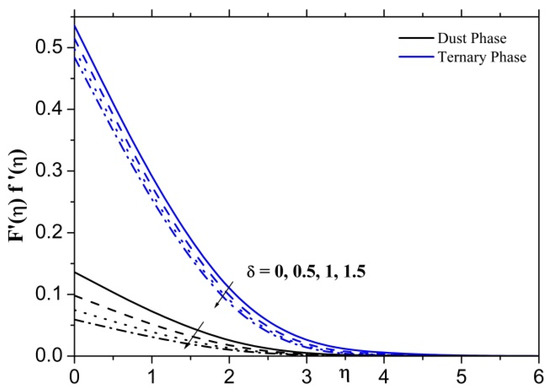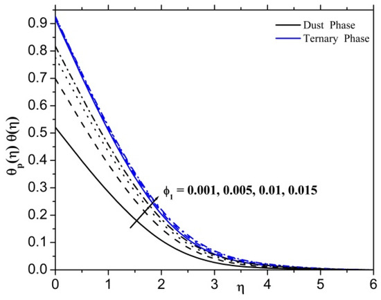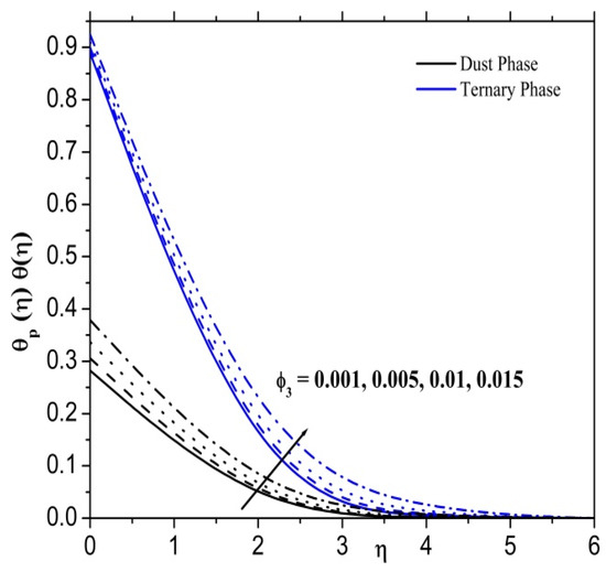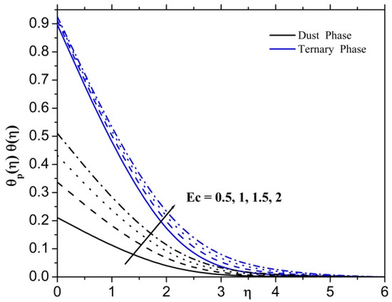 Figure 8 displays the changes in the thermal field for the ternary nanofluid and dusty fluid instances as a function of the parameter. To improve the parameter, it is evident that the thermal field rises in both ternary nanofluid and dusty fluid phases. Physically, the Eckert number is the ratio of kinetic energy to the specific enthalpy difference between wall and fluid. Therefore, an increase in the Eckert number causes the transformation of kinetic energy into internal energy by work that is done against the viscous fluid stresses. Due to this, increasing enhances dramatically the temperature of the fluid.