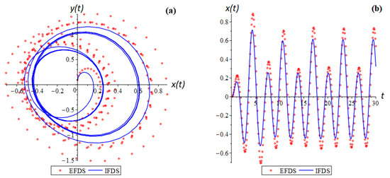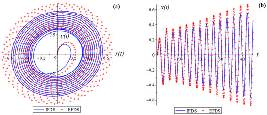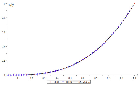 Let us consider the case when the conditions of Theorems 1 and 2 are met for the EFDS. In the model Equation (1), we select the following parameters: , , and