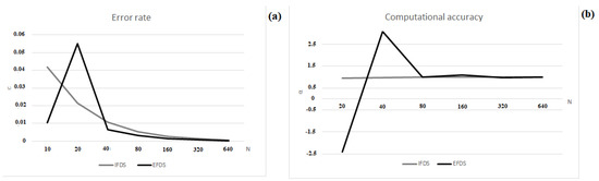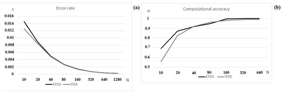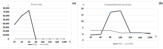 In violation of the conditions of Theorems 1 and 2 for the EFDS, the error (Figure 7a) and computational accuracy (Figure 7b) of the method has a pronounced non-monotonic character in changing its values, which confirms the violation of the stability and convergence of scheme (7). The stability of the IFDS (8), in turn, does not depend on the conditions of Theorems 1 and 2.