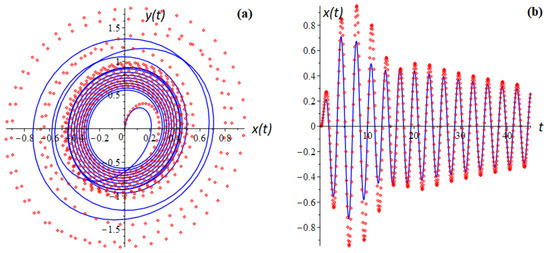 where is the displacement function, is the coefficient of viscous friction, is the natural frequency, are set constants that define the initial conditions, and is the parameter responsible for the time scale. In Equation (1), the fractional derivative operator is taken in the sense of Riemann–Liouville.