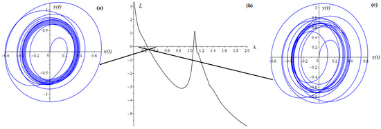 Figure 8b and Figure 9b show the spectra of maximum Lyapunov exponents depending on and q, respectively. With positive values of Lyapunov exponents, the phase trajectories enter a chaotic mode (Figure 8a and Figure 9a), and with negative values—a regular one (Figure 8c and Figure 9c).