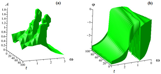 For practice, the most important cases are those when contains a periodic function depending only on time t, which has its own frequency and amplitude, different from the system under consideration. In this case, there is a superposition of oscillations of the external periodic force and natural oscillations of the system. The oscillations described by Equation (1) will reach a certain steady state over time. In such systems, it is often possible to observe such phenomena as resonance and bistability [8,41]. To study these phenomena, one of the important tasks is the construction of amplitude-frequency (frequency response), phase-frequency characteristics (frequency response) and Q-factor.